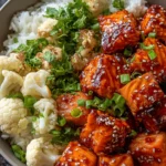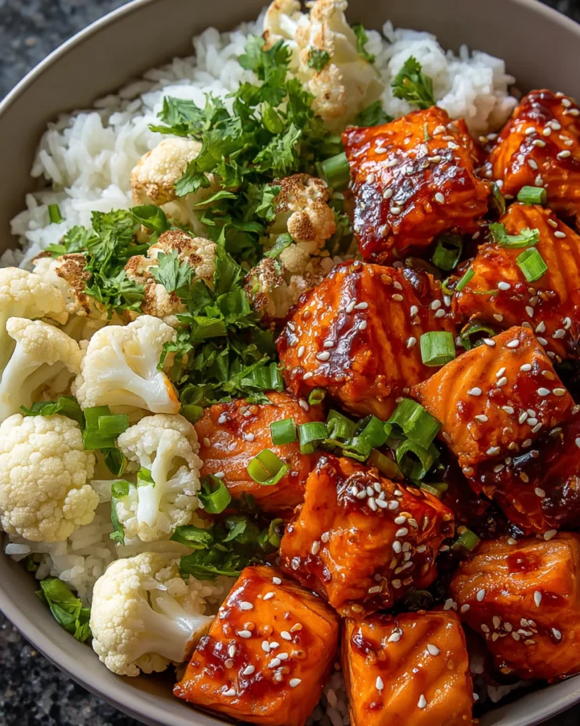 Now comes the fun part—assembling your bowls! Start with a base of fluffy jasmine rice. Add the roasted cauliflower and top it all off with the glazed salmon. Finish with a sprinkle of green onions, cilantro, and sesame seeds. It’s a feast for the eyes and the taste buds!