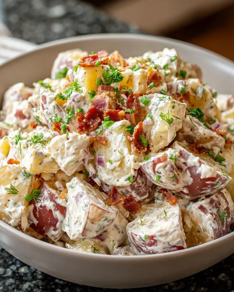 A creamy and flavorful loaded potato salad inspired by steakhouse favorites, featuring red potatoes, bacon, cheese, and a tangy dressing.