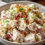 A creamy and flavorful loaded potato salad inspired by steakhouse favorites, featuring red potatoes, bacon, cheese, and a tangy dressing.