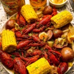 Once everything is perfectly cooked, work some kitchen magic by removing the boil from the heat. Use a large slotted spoon to transfer the crawfish, sausage, potatoes, and corn onto a lined baking sheet. Now, pour that luscious garlic butter sauce over the top and toss gently to combine all the flavors. Serve immediately, either directly from the sheet for a rustic feel or plated individually with lemon wedges. Enjoy every bite with family and friends!