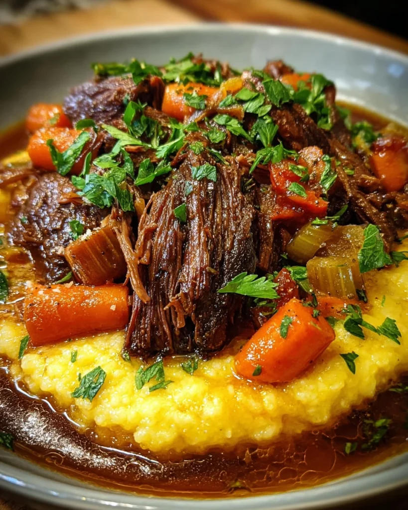 - Return shredded beef to the sauce in the pot, stirring to coat thoroughly. Serve hot over creamy polenta, mashed potatoes, or with thick slices of crusty bread. Finish with chopped fresh parsley and a sprinkle of Parmesan cheese if desired.