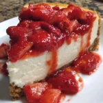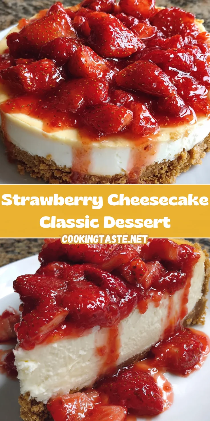 This Strawberry Cheesecake Classic Dessert features a rich and creamy cheesecake topped with a homemade strawberry sauce, all sitting on a buttery graham cracker crust; it’s the ultimate treat for any occasion.