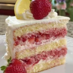 A delicious and refreshing Strawberry Lemonade Cake with layers of strawberry-flavored cake, lemon cream cheese frosting, and decorations of fresh strawberries and lemon slices.