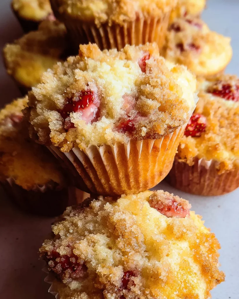 Delicious and fluffy strawberry muffins topped with a crumb topping, perfect for breakfast or a snack.