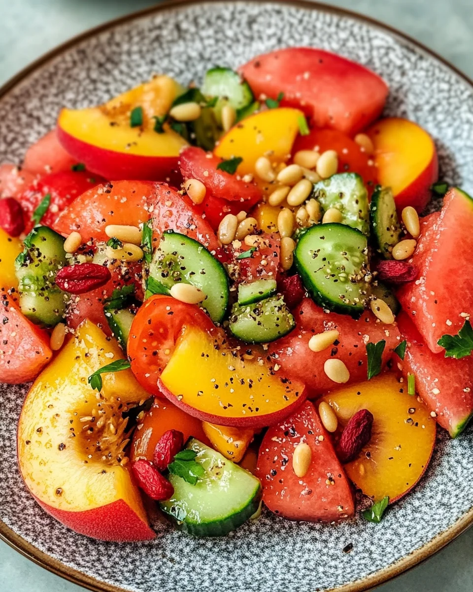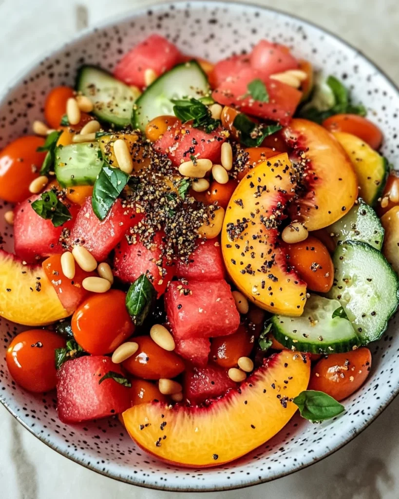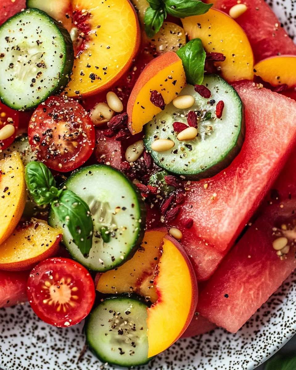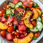 Now it’s time for some fun! Arrange the sliced watermelon, peaches, cucumbers, and tomatoes on a large serving platter or individual plates. The goal is to create a vibrant mosaic that invites everyone to dig in. Once arranged, drizzle your tangy dressing generously over the top. But hold up! Don’t dress it too early if you want it to stay fresh and crisp. If you’re making this salad ahead of time, wait until just before serving to dress it up!