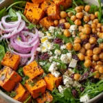 Now, let’s bring our Sweet Potato and Chickpea Salad together! In a large serving bowl, start by layering the mixed greens. Then, add your cooled roasted sweet potatoes, chickpeas, and the sliced red onion. It’s like painting a pretty picture—each ingredient has its space and shines!