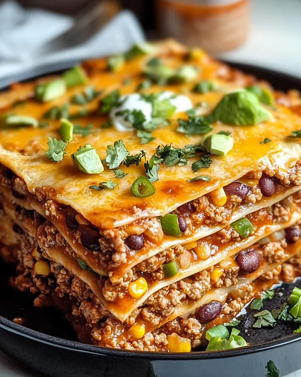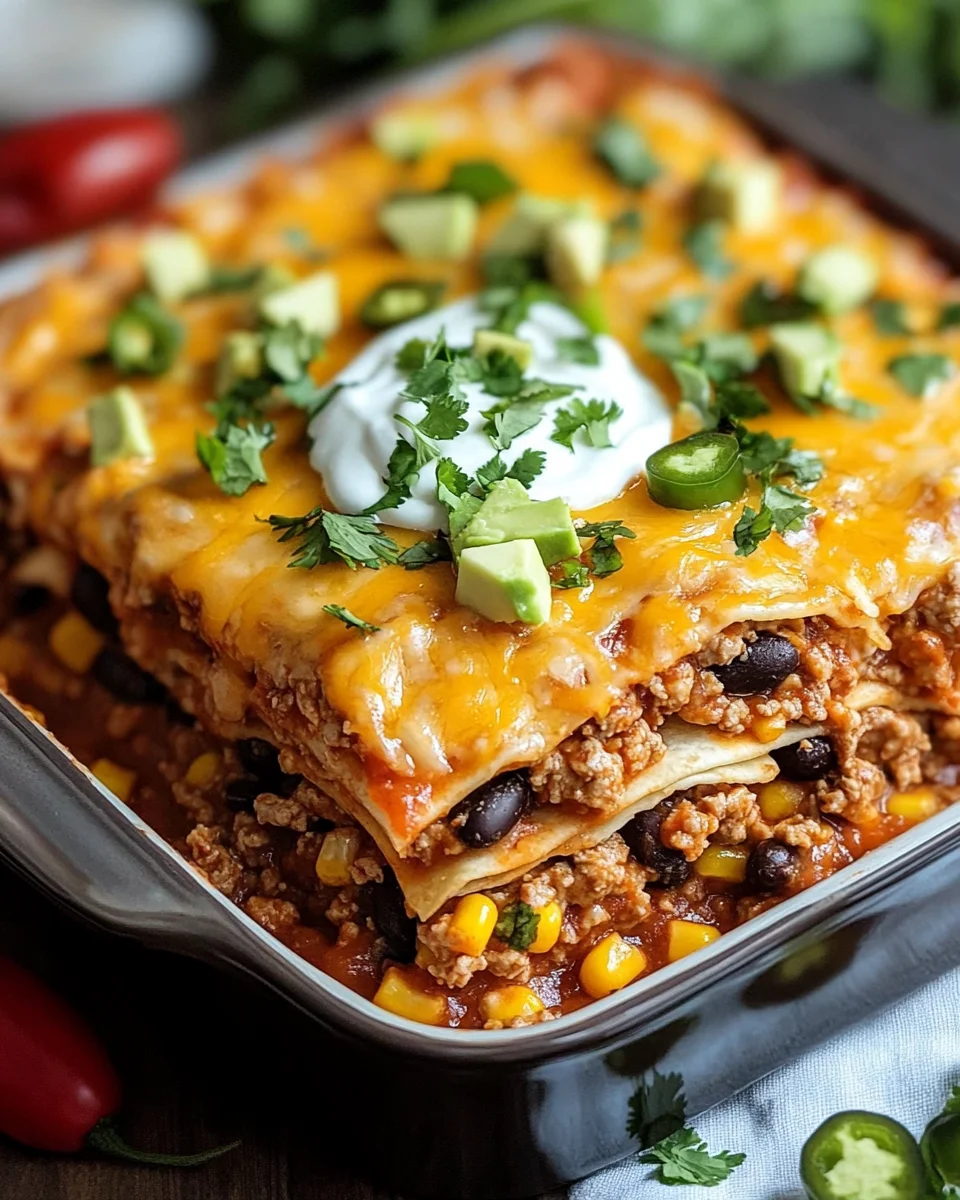 Once baked, take your Taco Lasagna out of the oven and allow it to rest for about 5 minutes. This helps with slicing. Garnish with fresh cilantro and sliced green onions. Serve it up with optional toppings like avocado, jalapeños, or extra sour cream. Your family won’t just eat this meal—they’ll relish every delicious bite!