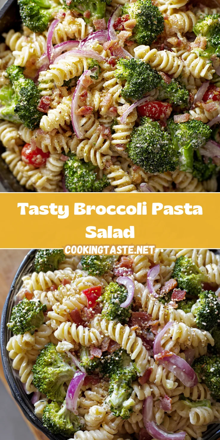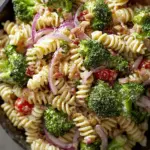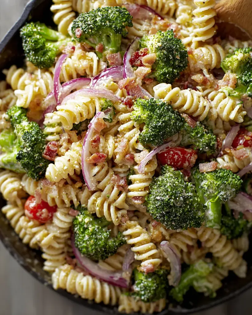 A refreshing and flavorful pasta salad featuring rotini pasta, broccoli, and crispy bacon, all coated in a creamy dressing.