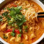 A flavorful and creamy Thai red curry noodle soup featuring tender chicken, coconut milk, and aromatic herbs.