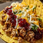 A creative twist on Thanksgiving leftovers, these smash burger tacos combine ground turkey, crispy tortillas, and traditional stuffing, topped with cranberry sauce.