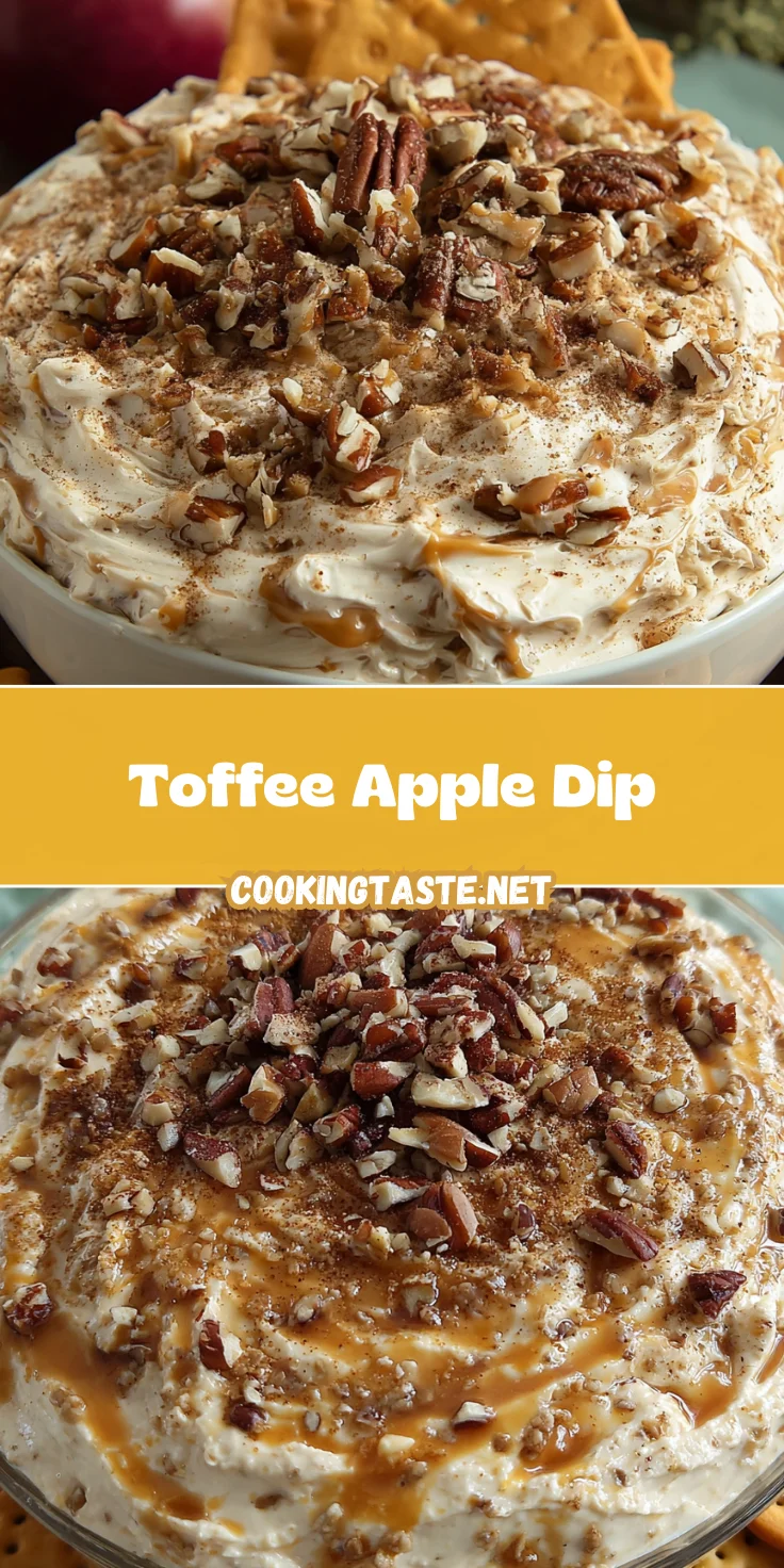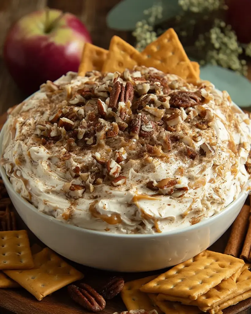 Toffee Apple Dip is a creamy and sweet dip enhanced with toffee bits and pecans, perfect for serving with fresh apple slices and other snacks.