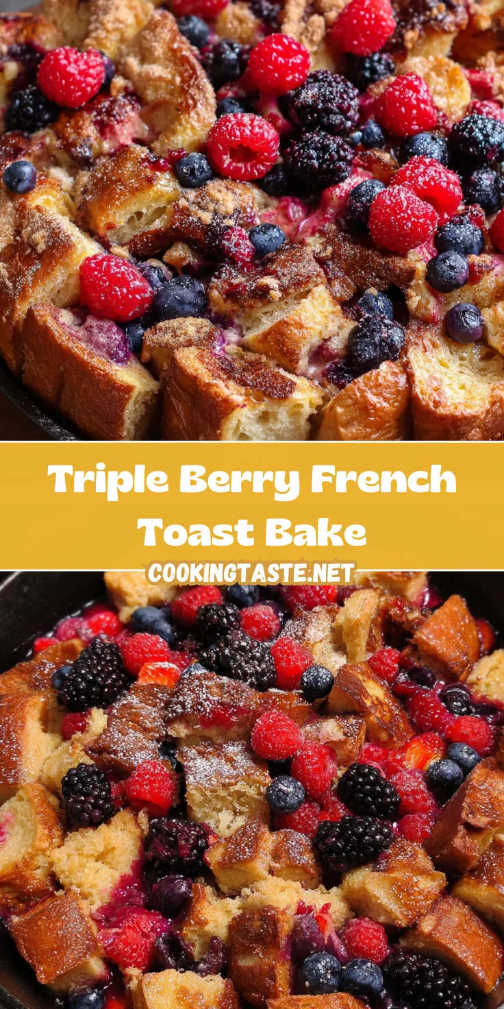 A deliciously indulgent Triple Berry French Toast Bake, perfect for breakfast or brunch, featuring layers of custard-soaked bread and a delectable berry mix.