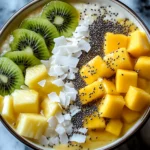 Top each bowl with shredded coconut, a few pineapple chunks, and slices of vibrant kiwi. A sprinkle of chia seeds adds a delightful crunch. It’s all about creating a feast for your eyes as well as your taste buds!