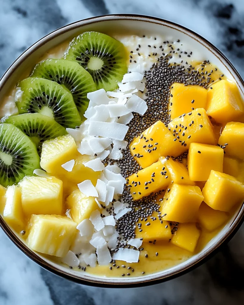 - Pour into bowls and top with shredded coconut, pineapple chunks, sliced kiwi, and a sprinkle of chia seeds.