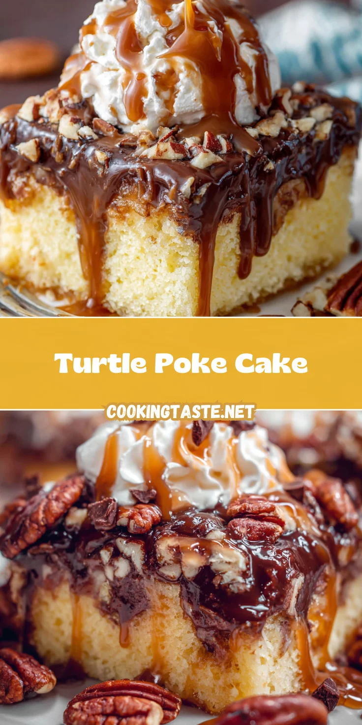 Turtle Poke Cake is a decadent dessert that combines moist yellow cake with caramel and chocolate, topped with whipped frosting and nuts for an irresistible treat.