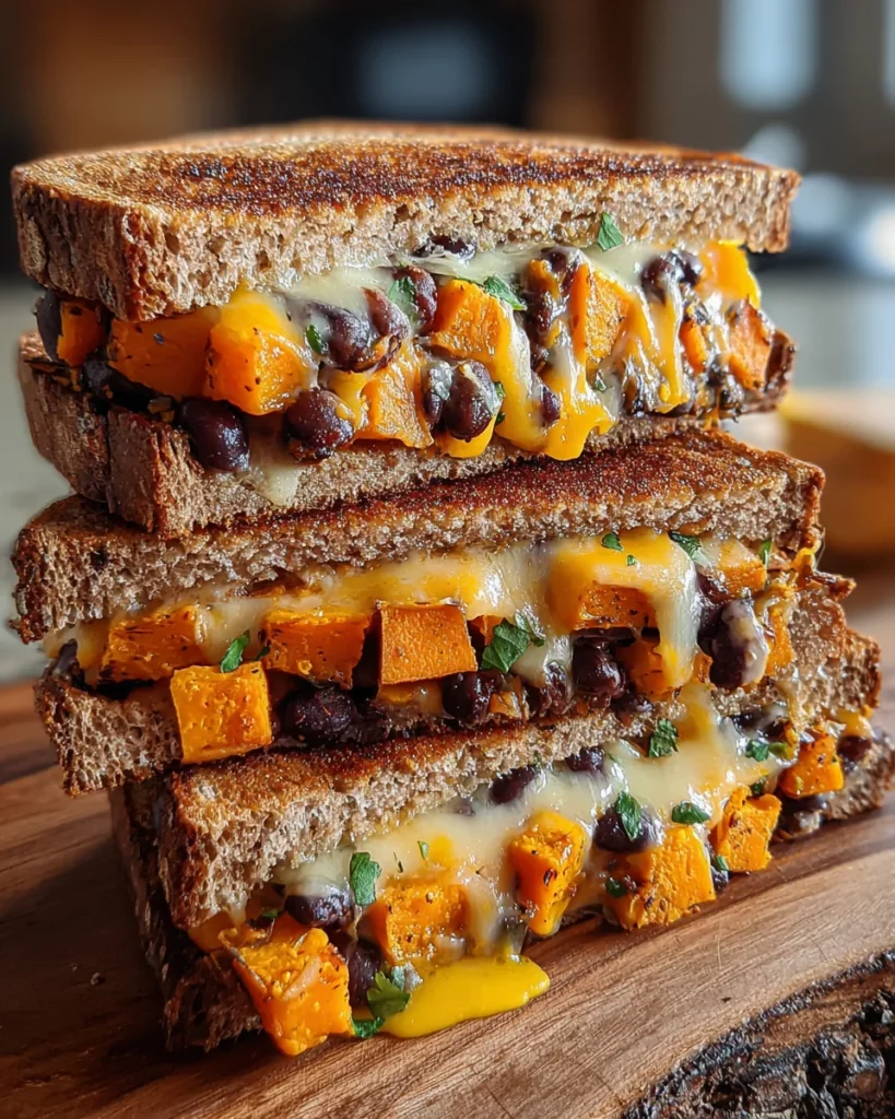 A delicious vegan sandwich featuring roasted sweet potatoes and black beans for a hearty and satisfying meal.