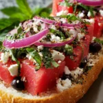 Now it’s assembly time, and this part is super fun! On the bottom half of each toasted roll, place one slice of watermelon. Then, evenly sprinkle a generous amount of crumbled feta on top. Next, add sliced Kalamata olives and a few rings of red onion for that kick. Finish by scattering fresh mint and basil leaves atop the salad of flavors. This combination is where the magic happens, melding sweet, savory, and aromatic all in one bite!