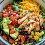 - Combine Salad Ingredients: In a large mixing bowl, add the chicken, black beans, corn, diced red bell pepper, red onion, cherry tomatoes, avocado, and cilantro.