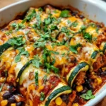Zucchini Enchiladas are a healthy twist on traditional enchiladas, featuring zucchini slices filled with a delicious mixture of chicken, black beans, corn, and spices.