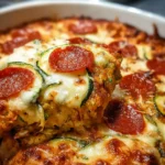 A delicious and low-carb pizza casserole made with zucchini, topped with cheese, pepperoni, and vegetables.